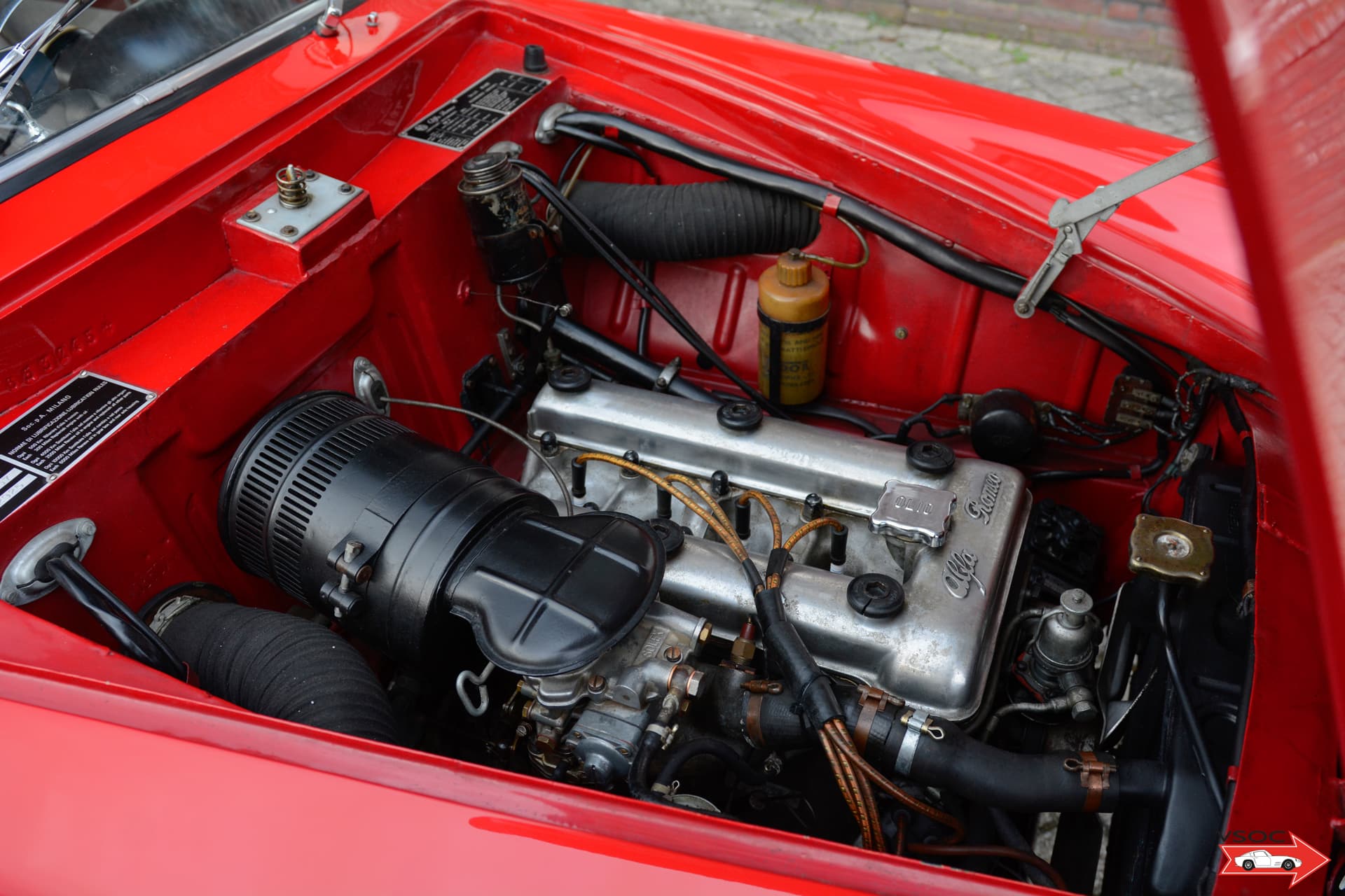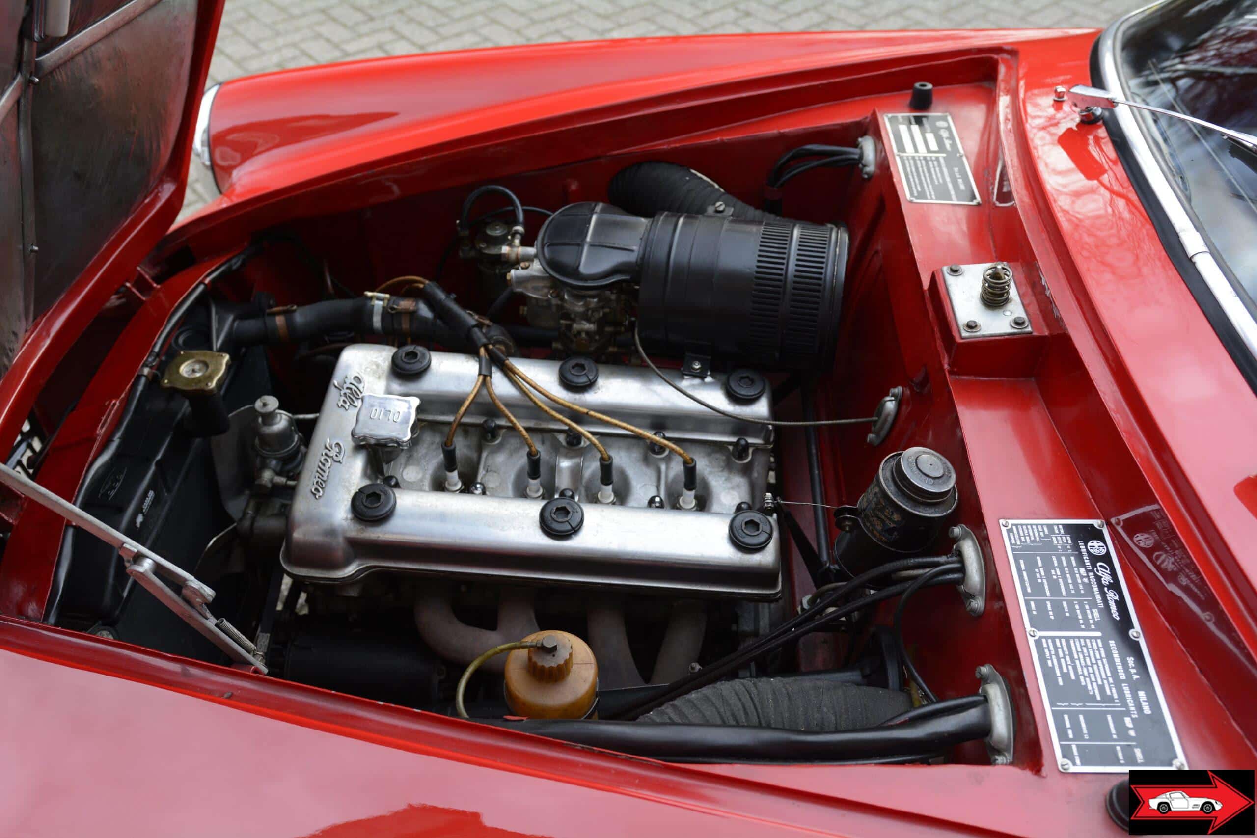 The Giulietta was powered by a 1290 cc Alfa Romeo Twin Cam inline-four engine, featuring an aluminium alloy block with cast-iron cylinder liners. Its crossflow cylinder head incorporated hemispherical combustion chambers, while the double overhead camshafts – driven by twin timing chains – operated two valves per cylinder angled at 80 degrees.