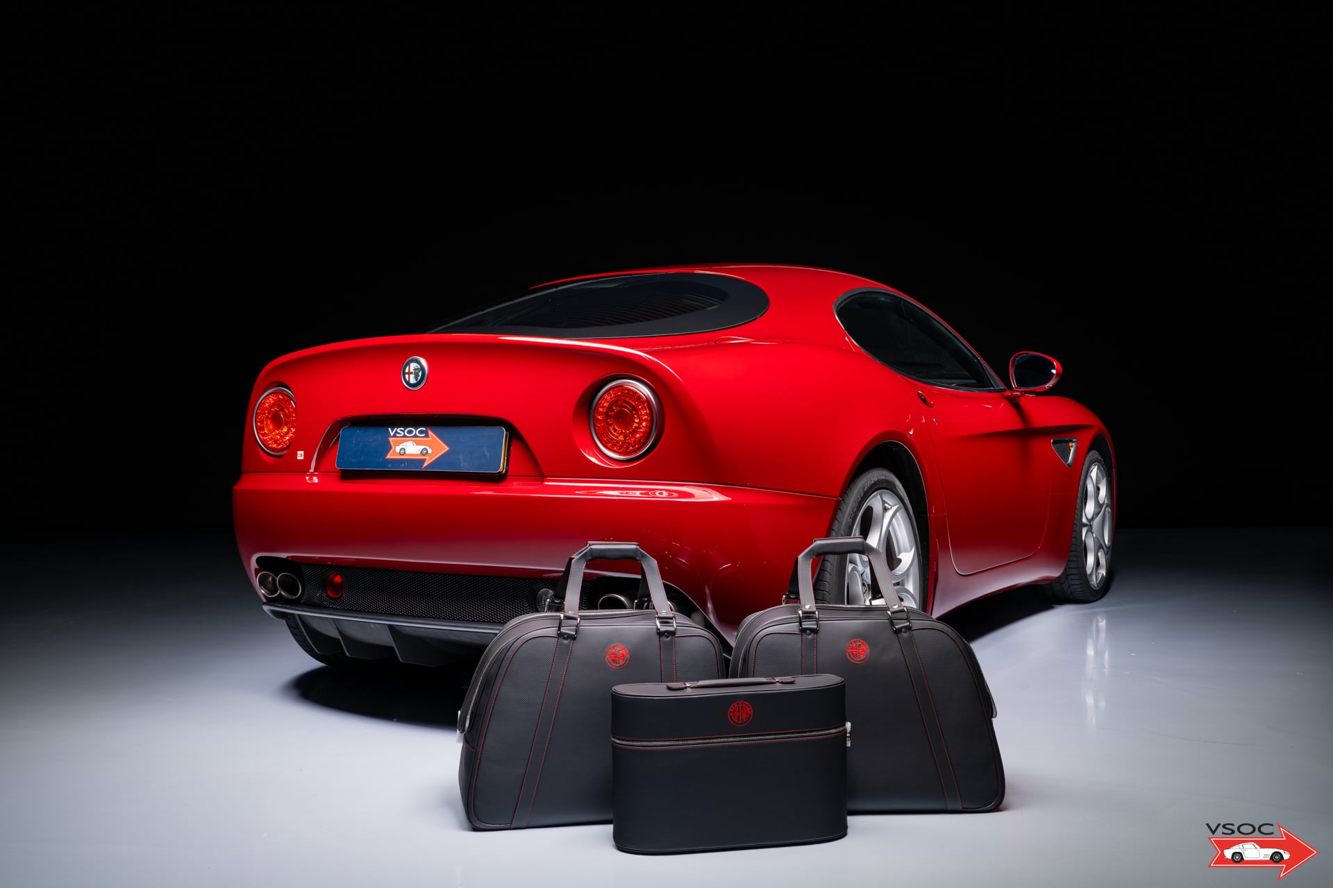 ‘Rosso Alfa’ with a black leather interior. Complete with Schedoni leather luggage set!